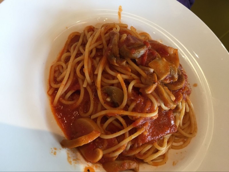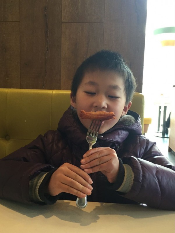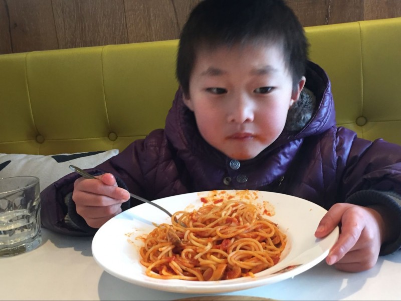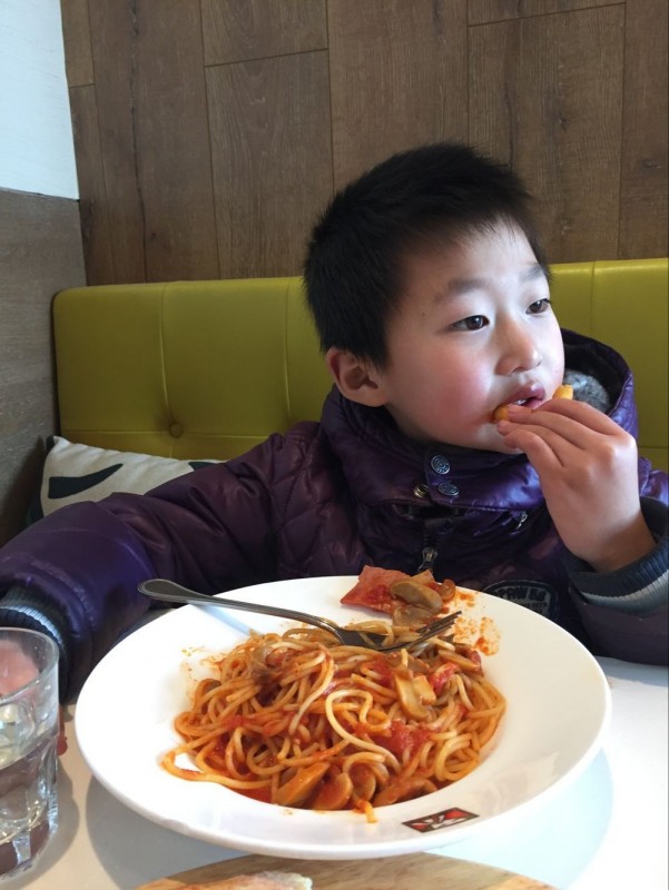 最后上的就是意大利面,我记得上次来吃也是剩下的就是意大利面,这一次点点就吃了意大利面上面的蘑菇和培根,下面的面条也就不吃了,真是很浪费啊。吃一堑长一智,下一次我再也不会点意大利面啦。点点吃完这么多东西就去下象棋了,我就在一边休息,喝喝水,直到下午一点半我们才离开餐厅去楼下玩绳索了。