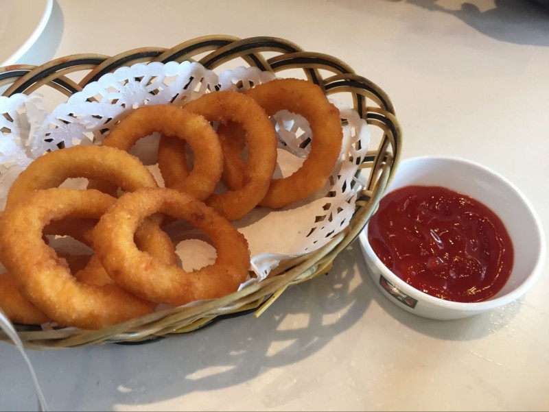 然后就是上的洋葱卷,这个洋葱卷是一个个小圆圈圈,里面有洋葱的味道,洋葱卷又脆又香,点点蘸着番茄酱吃了好几个呢,要不是因为咳嗽,估计点点会全部把它吃完的。