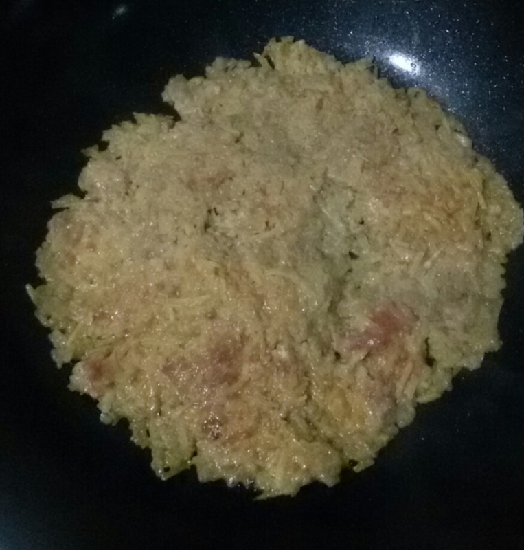 材料准备:土豆一只(约150克)、面粉适量、猪瘦肉适量 步骤: 1、土豆洗净去皮,然后擦丝,备用;(注意:土豆擦完丝后最好马上做土豆肉饼,否则擦了丝的土豆是会被氧化变色的) 2、猪瘦肉适量、洗净剁碎,放碗内,然后加入适量的盐、花生油、胡椒粉和酱油搅匀,然后再加入土豆丝和适量的面粉继续搅拌,备用; 3、不粘锅洗净,加入适量的花生油,摇匀,让花生油铺锅底,然后再加入土豆肉末摊平(中小火慢煎),煎至变色后即翻到另一面继续煎,如此反复两次后,即可关火盖上锅盖继续焖一会,然后再出锅食用。