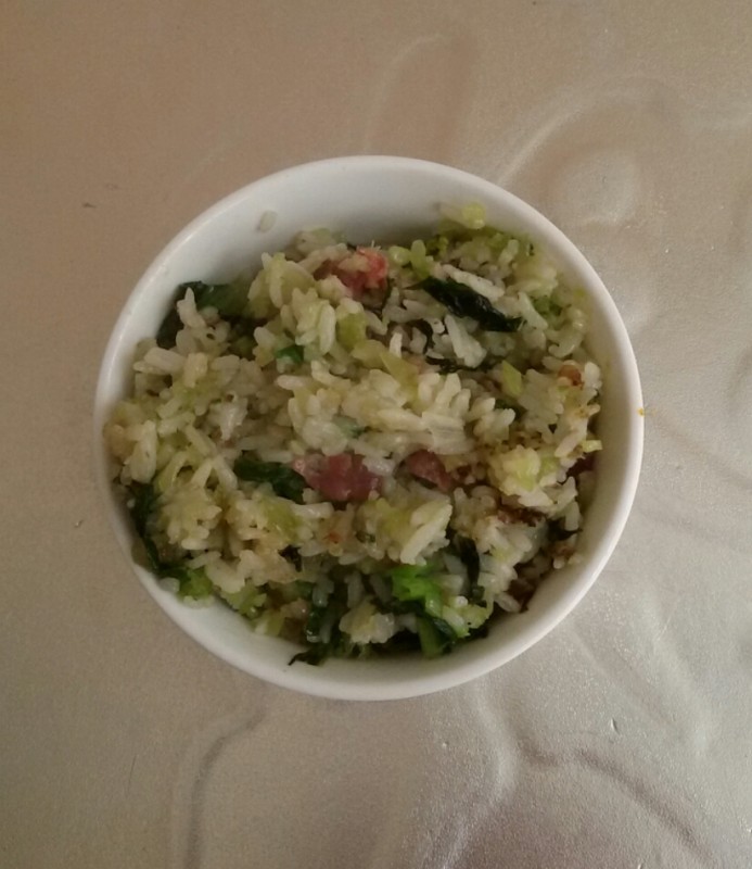 其实,老公炒饭的方法也很简单,就是放米饭之前把那些腊肠、窝苣丁、萝卜丁都用油和盐炒一遍,然后把它们盛起来,然后再把米饭放到锅里面炒,然后再把炒过的材料都放到锅里一起炒熟即可。虽然他用的是热的米饭炒,但炒出来的饭还是蛮可口的,孩子也喜欢吃。