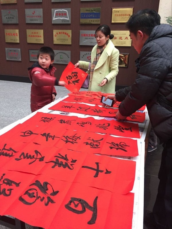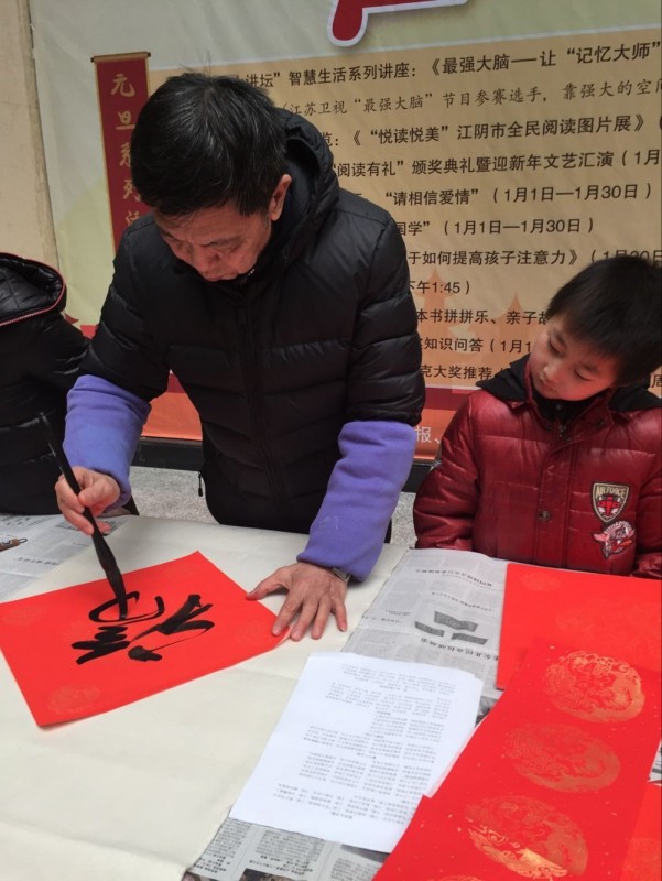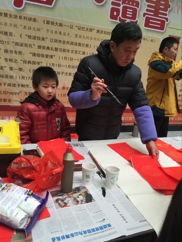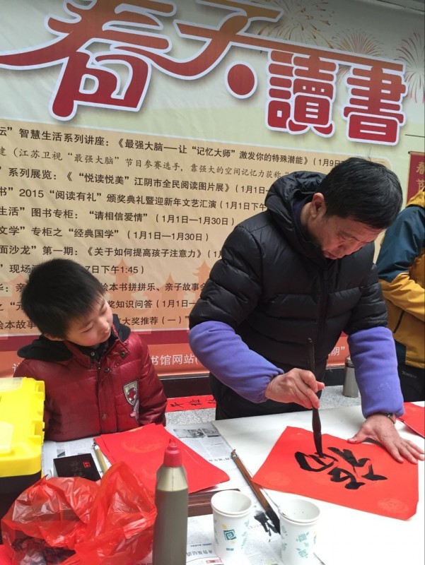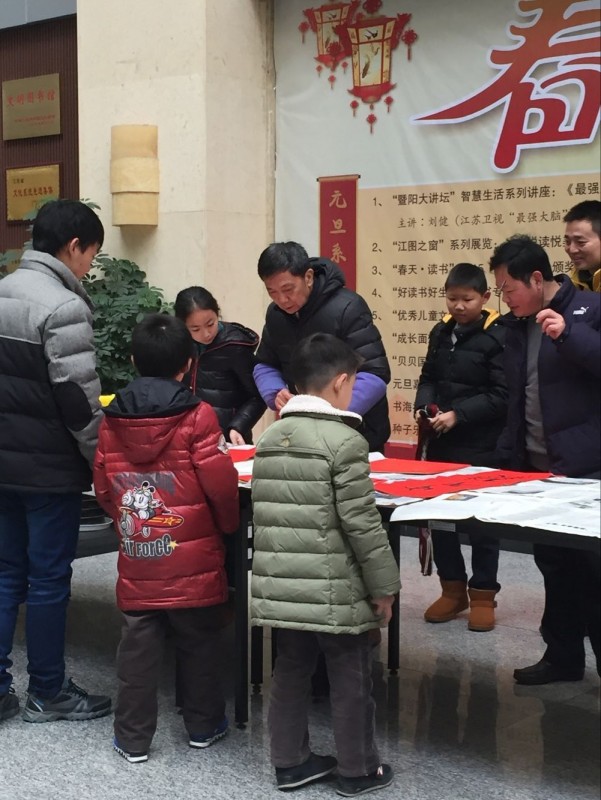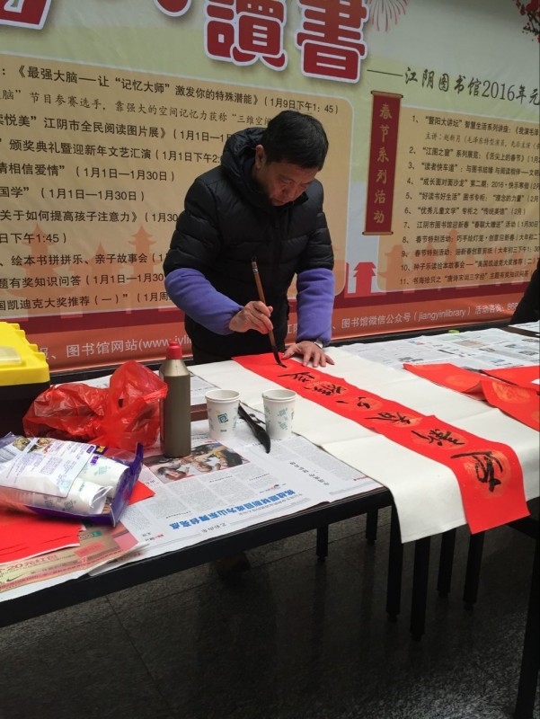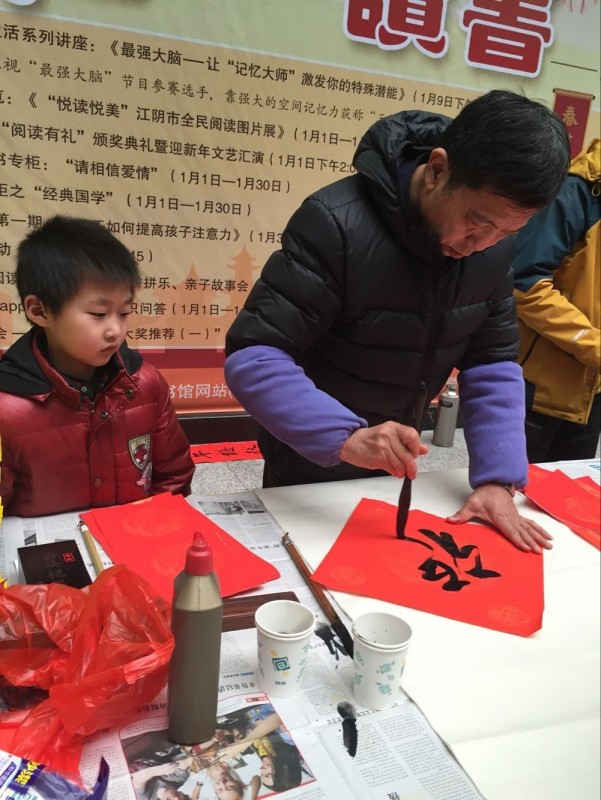 今天很有幸,我们在图书馆看书的时候,走到大厅里看见很多人在排队,好奇心促使我们也走过去凑热闹了,于是我们走过去一看,一位老爷爷正在义务为市民写春联呢,只要我们用图书馆的读书证件登记一下,就可以免费领一副对联和一个福字,领了纸张就可以去老爷爷那边让他写对联了。