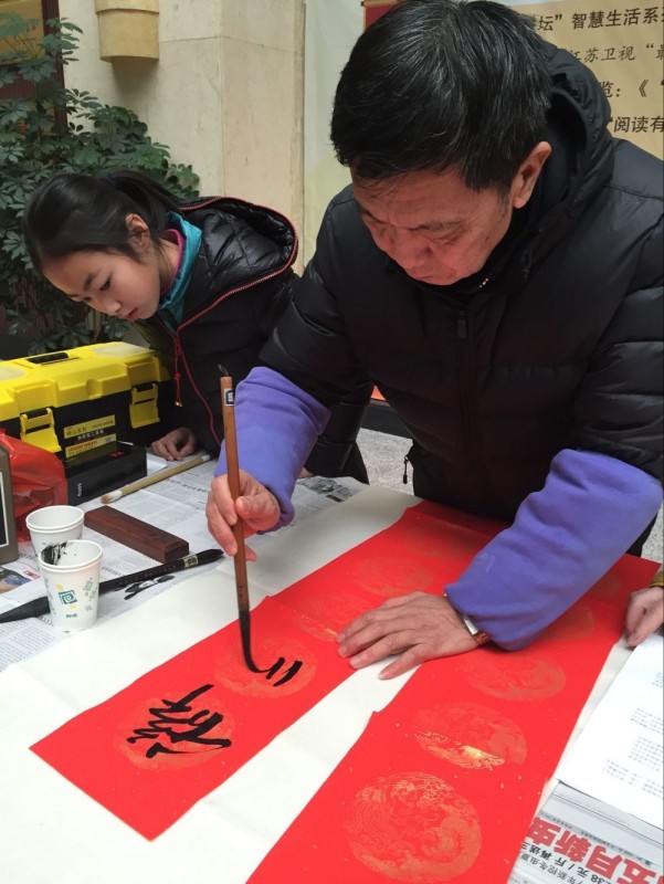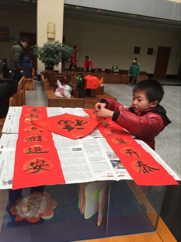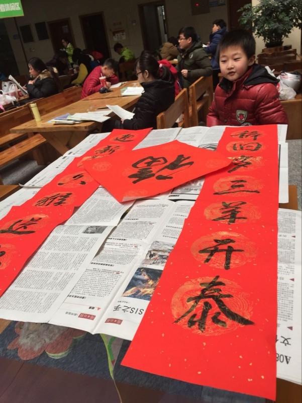 春节就要到了,我记得我们小时候都是自己写对联的,爸爸告诉我咱们中国人过年就喜欢贴对联,写对联,自己写的对联贴上门才是最棒的。于是我就和点点说,新年要贴对联,首先就要写对联,你看着老爷爷写,看看写的好不好,如果觉得毛笔字很有趣,妈妈就回家教你写毛笔字了。点点说好的,一边看老爷爷写字,一边啧啧赞叹:“这个毛笔字写得真好啊!” 点点在一旁看的时候,还有人在为老爷爷研磨呢,一开始的墨比较淡,后来磨得越来越好了,写得字也是越来越好了。