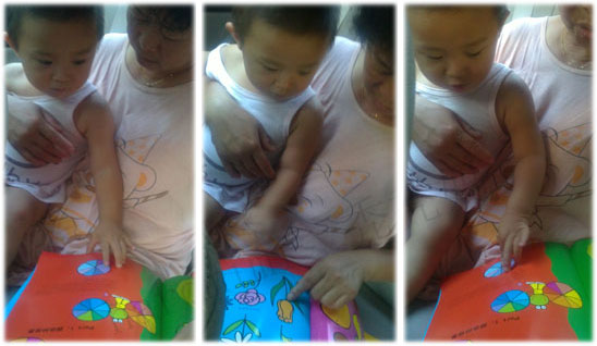 晚上洗完澡,姥姥帮秃秃洗衣服,奶奶带着他继续看书。本来小家伙正全身心的投入在用小铲子盛积木的乐趣当中,不爱学习的他,起初对这个学习时间有些许不满,嘟着小嘴无奈的翻看着。经过一小段时间的熟悉,更主要还有奶奶耐心的引导,小家伙不再烦躁,已经可以踏踏实实的自己边指边说。