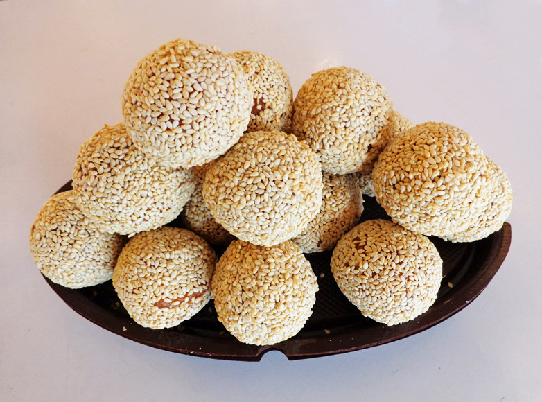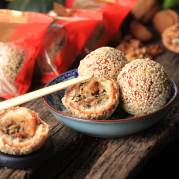 大蜜枣的名字由来,是因为它形像大枣,外挂蜂蜜糖浆,外表看起来像麻团,但真的不是呢,里面的馅料很丰富的,主料有蜂蜜,香油,芝麻,蔗糖和面粉,辅料有玫瑰,冰糖,桃仁,花生,红绿丝和米稀等,外面一层厚厚的芝麻,里面还有好多的芝麻,吃起来特别香脆!