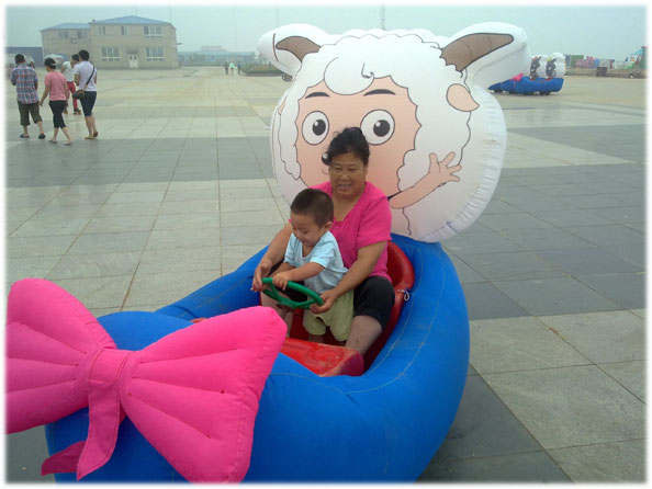 小家伙只坐了两款充气大船,一个美羊羊,一个红太狼,果然是他的style!在家我陪他一起玩羊羊玩具时,他就最爱这两个人物(不过他还不会说红太狼的名字,在他嘴里,两个都是美羊羊,在他眼里,红太狼比美羊羊还要漂亮!)。姥姥陪他坐了一会儿,奶奶也有些按捺不住,在秃秃换坐第二艘充气船时,奶奶赶紧跑过去跟他合了几张影……