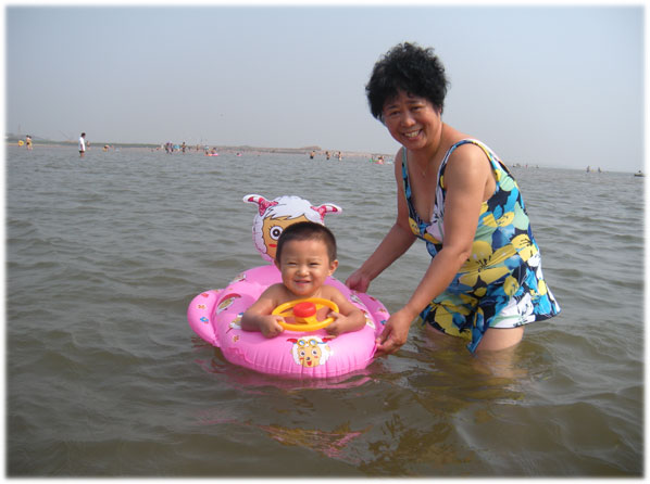 秃秃是我们家的主角,谁都抢着跟他合影,姥爷也来凑热闹啦!还不错,知道带上小家伙的沙滩玩具,还有秃秃最心爱的小桶~~看看姥爷那幸福的笑脸,就知道有多爱孙子!游了好半天,尽管一直在游泳圈里漂着,可还是会消耗些体力,主管后勤工作的姥姥,带着小家伙上海滩去找些吃的。在姥姥怀里香香的啃着老玉米,他这小日子过的是真滋润!