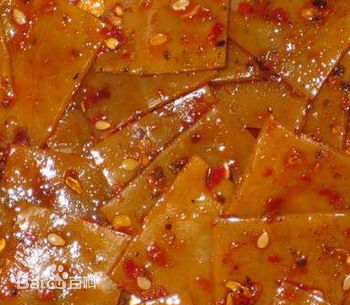 美食二:豆腐干 豆腐干是我的最爱,我吃了很多地方的豆腐干,觉得最美味的还是家乡的豆腐干。家乡的豆腐干中又以大竹观音贺家的豆腐干最好吃,最有名气。观音豆腐干在四川又被人称为“仁”字豆腐干。其已经有百年的制作历史了,主要产于四川大竹。豆腐干皮面光洁润滑细腻,呈金黄色;闻之,甘香味浓,芳香四溢,引人食欲;食之,甘甜可口,越嚼越香,回味悠长。同时,具有绵实特点,每张折成三折,可承受约25公斤重的拉力。我最喜欢做的事情,就是拿一张观音豆腐干,一边慢慢地嚼着,一边看书。书香与豆香交织的味道,对我来说,真是无比的美味啊!上张图,让大家现垂涎欲滴一回。