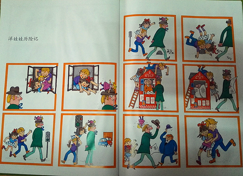 大家一定都还记得那个满脸雀斑,一头红发的长袜子皮皮吧!她就是罗尔夫•雷蒂希和作家林格伦合作创作出经典的形象。罗尔夫•雷蒂希和他的夫人玛格丽特•雷蒂希都是德国儿童文学界的大师级拍档,他们共同创作的作品曾多次获得过德国绘本大奖,被誉为德国儿童作品的璀璨明珠。《可爱的倒霉蛋们》里刻画了很多令人忍俊不禁的形象。看封面的两位夫人,她们一定是闺蜜或好友,忙着聊天的二位可没有注意手里牵着的小狗,它一会儿追松鼠,一会儿扑蝴蝶……不知不觉间长长的牵狗绳已经一圈又一圈的把主人们的腿都缠起来了,如果小狗全力去追另一只挑衅的小狗,后果真是不堪设想啊!再看看环衬,一位典型的德国绅士,高礼貌,整洁的燕尾服,彬彬有礼地戴着眼镜,手里还握着他的长柄伞,可是风儿、雨儿都在和他开玩笑吧!全书共记录了十二个生活中的小插曲,他们有的看起来可能不是那么美好,但只要你学会乐观和豁达,我们就看作是生活给我们开的小玩笑。《小鱼大力士》《花园里的恶作剧》《 献不出去的花》《吃蓝莓的代价》《 吃不到的樱桃》这些故事咋一看好像就发生在你我他的生活里,被我们碰上都难免会有“哎呀,今天真倒霉。”的感受,其实我们微笑着去仔细品味其中的俏皮与生动,我们的生活是不是就会少很多的抱怨,更学会感恩呢?《 跷跷板》《洋娃娃历险记》《新裤子》《滑雪橇》《 装扮雪人》则更是生活中孩子们生活的实录,其中的晶莹童趣只会让我看到温暖与快乐。