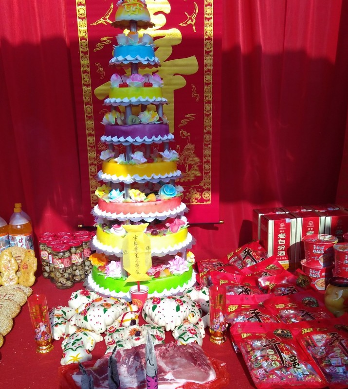 山西久负盛名的土特产,还是平遥牛肉、太谷饼、汾阳汾酒和清徐老陈醋,山西面食种类之多也是天下无双,刀削面已经走向大江南北,山西人喜欢吃醋也是有了名的,而且陈醋在华北地区也大有市场。说起吃醋如何就和嫉妒挂上钩的,这要从唐朝开元年间宰相房玄龄纳妾开始,当时房玄龄的夫人坚决反对丈夫纳妾,唐太宗出面干涉,令房夫人在喝毒酒和纳小妾之中选择其一。没想到夫人十分刚烈,宁愿一死也不在皇帝面前低头。于是端起那杯“毒酒”一饮而尽。当房夫人含泪喝完后,才发现杯中不是毒酒,而是带有甜酸香味的浓醋。从此便把“嫉妒”和“吃醋”画上等号了。山西的汾酒是中国清香型白酒的代表,有4000年的悠久历史,近年来在汾酒集团多年不懈的市场开发、品牌培育和文化熏陶之下,汾酒已经成为响当当的驰名商标,当地的酒文化也是独树一帜,从中看到中华文明的灿烂与辉煌。 这次回家一个重要的活动是给母亲拜寿,当天看到供桌两侧摆放着20公分的寿饼,每个饼上写着一个字,合起来是福如东海长流水,寿比南山不老松,中间是直径稍大一些的是用繁简字体做的七个寿饼,寓意齐齐整整,顶面是九个葫芦形状的饼子,寓意长长久久。蛋糕八层高,寓意是庆祝八十寿诞,旁边摆放着汾酒,牛肉,还有代表健康平安的四件宝,分别是健力宝、康师傅方便面、苹果罐头、鹌鹑蛋罐头,下面摆着长寿挂面和叫不上名字的花馍。听了家里人的介绍我才如梦方醒,真的佩服办事人的贴心安排。