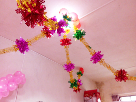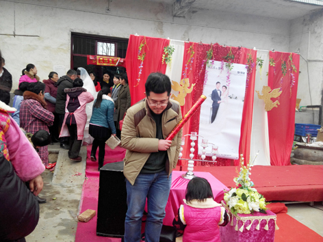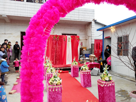 只不过照相的太多了,晨晨就只能够照一张了,屋内的新娘子正在静静的等候着大院外面的婚礼现场,因为再过二个小时,婚礼现场就要举办了,在农村很多家结婚都会请司仪的,而且都在自家的院子里举办,这样既跟饭店里的仪式一样,而且还非常的热闹,对于我和孩子来说,可真是第一次看到可以在自家院子里做婚礼现场呢,晨晨感觉非常有意思,在婚礼现场有彩虹门、彩带、汽球一样也不少,还有红红的地毯,好热闹的感觉。