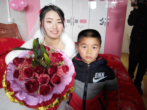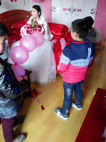正月是结婚的好日子,特别是初六或者初八,而我的表弟就是初六结婚,虽然表弟的房子买在了合肥,不过结婚办的酒席还是决定在老家办理,毕竟老家的各方面开支要便宜一些,老人们能够买一套房子已经很不容易了,为了能够参加到这一场婚礼,我和妈妈还有晨晨可是初五就来了,因为我们都非常期待这一场婚礼呢,婚礼举办是在下午的四点,不过下午一点左右的时候新娘子就来了,听到炮竹的声音,晨晨一下子就跑了出去,一看就是一个爱凑热闹的家伙,我们看到了美丽的新娘子,然后新郎官把新娘子抱到了楼上,二楼就是她们的婚房。 这里的婚房比较简单一些,主要是她们只在这里办酒席,以后不会住在这里的,他们会住在自己的新家,所以老家就简单装修了一下,看房顶上很多的彩灯和汽球,给我们带来了更多的喜悦,小朋友们在新房里面快活的玩着,然后吵着要喜糖吃,今天的喜糖吃再多也不会腻的,不过这里有一个习俗就是新娘子不能够说话,好奇怪的习俗,晨晨一直在和新娘子说话,可是新娘子摇了摇头,没有办法,习俗就是习俗,我们可不能够改变呢,这位美丽的新娘子就是晨晨的亲表婶,因为结婚的是我大舅家的孩子,所以肯定要来一张合照啦。