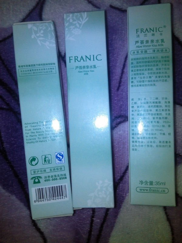 这款法兰琳卡芦荟亲亲水乳,可是肌肤年轻水润的保湿圣品哦,1瓶抵4瓶,芦荟亲亲水乳=爽肤水+乳液+精华乳+睡眠面膜,这很省事,我本来就不用化妆品,对于左一层右一层的涂抹就觉得很是麻烦,这款芦荟亲亲水乳真是懒人的福音啊,简单快捷。但我自己才刚刚用,有没有效果就不知道了,目前就觉得搽在脸上挺舒服的。