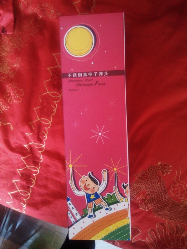 今天上午喂过女儿后,带着儿子去了超市,就去新超市的楼上看了下,这保温杯哪里是卖完了啊,明明还有很多的,真不知道老公是怎么找的,居然说卖完了,真是无语啊。看了下,还是特价,嘻嘻,赶紧下手,350ML容量的杯子卖11.9元,500ML的卖12.9元,就相差一元钱,就打算买12.9元的。 这款杯子外包装设计花了不少心思啊,正面有小男孩在玩,很开心,颜色也很鲜艳,让想购买杯子的人能够一眼就看到它,很吸引人。背面下方有个小圆孔,为消费者提供了方便,不用打开就可以看到里面是什么颜色的。记得上次给爸爸买的时候,我没有注意到这个细节,想看颜色就只能一个一个的打开看,真是累人。这次看到了,挑选很快。