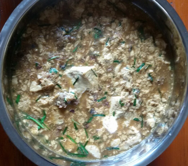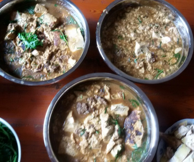 因为要忙活其他的事情,所以塘虱鱼酿豆腐的全过程我没看到,只在吃饭的时候看到做好的塘虱鱼豆腐。老实说,这塘虱鱼酿豆腐的味道实在太鲜美了,塘虱鱼肉被堂哥剁得碎碎的,一点鱼刺也吃不出来,自家做的豆腐又美味又滑嫩,再配上绿色的韮菜,使得这道菜更美味了。虽然餐桌上摆满了鸡鸭、排骨、鱼丸等好吃的美食,但大家都特别喜欢吃塘虱鱼酿豆腐,不一会儿,一大盆的豆腐就被吃了大半盆了。 其实,这塘虱鱼酿豆腐的做法也不是很复杂,关键是要把塘虱鱼身上的泥都洗干净,然后再用开水洗一次,再用盐抹一下鱼身,把塘虱鱼身上的泥味都祛掉,然后再把塘虱头去掉(鱼头可以用来煲黑豆汤),剩下部分然后再起骨,只取鱼肉部分剁碎来酿豆腐。听堂哥说,这道塘虱鱼酿豆腐可是花了将近两个小时煎好的。虽然是这样,但我觉得这豆腐吃起来一点都不老啊,估计是技术问题吧。