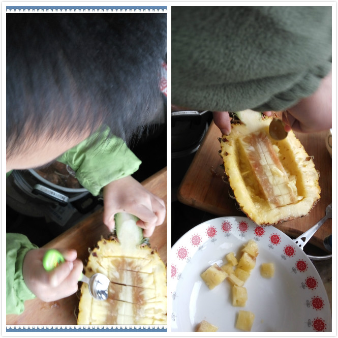 呵呵,切菠萝可是力气活呀,全家人一起动手,也是很有节日气氛的!