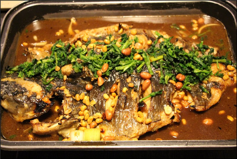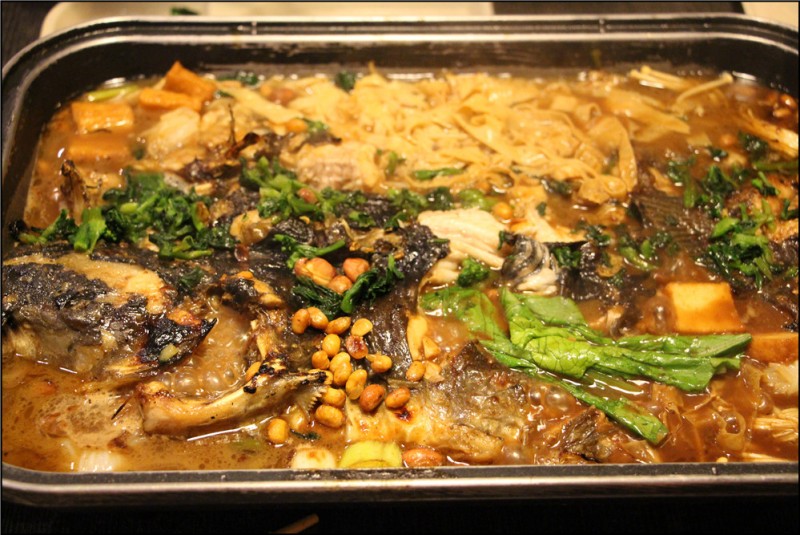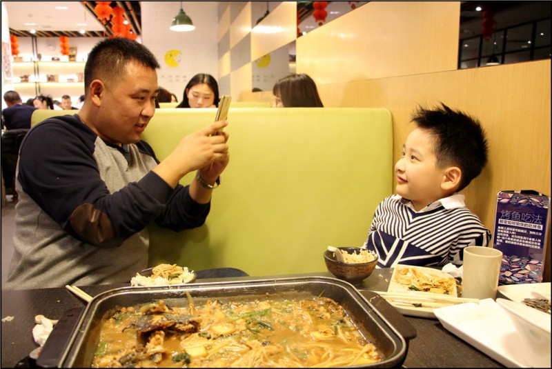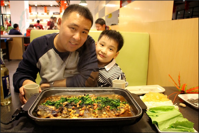 最终我们选择了清江鱼,挑选了一条接近4斤的清江鱼,就这样一条鱼已经二百了。带着Aric全程看选鱼、杀鱼(一根铁棍砸头致死)、解剖、清理,Aric感慨清江鱼真可怜,我调侃你可以选择不吃它。但是真到清江鱼上桌了,Aric吃了第一口后就立马停不住嘴里,嘴里念念有词着,烤鱼真好吃,清江鱼真好吃。其实在选鱼的时候是Aric第一次见到清江鱼,当时还满脸惊讶,说这是鲇鱼呢,不过比起鲇鱼又有很大的不同,总之比起鲇鱼要干净,要好吃,而且也适合小朋友吃。 另外点了一份蔬菜拼盘,包括金针菇、豆腐皮、小油菜、宽粉,然后给Aric点了一份鱼豆腐,结果小家伙还不爱吃。老公不可避免的又是一瓶啤酒,这自己喝啤酒也不嫌无聊。虽然是冬天,但是一家人吃的还是满头大汗的,老公看Aric那头发快竖起来的样子特别搞笑,赶紧拿出手机给宝贝拍了一张,然后发朋友圈。Aric因为有妈妈经常拍照已经习惯,看到爸爸拍照照样立马展示出笑颜,拍出几张让爸爸满意的照片。喜欢卖萌的儿子遇到了爱晒娃的爸爸,可真是擦出了许多快乐的小故事呢。 ![]() ![]() 等来了我们的清江鱼,为了Aric而选择的酱香口味。 ![]() 还有必不可少的一些配菜。 ![]() 鱼豆腐真是蛮少的,盘子倒是老大个。 ![]() ![]() 吃吃鱼,加点汤,放些青菜又一顿。 ![]() 吃饱喝足后,满身大汗的Aric被爸爸抓包拍照发朋友圈喽。
