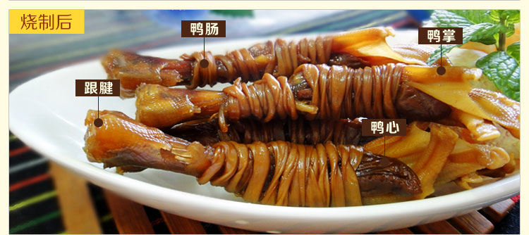 这也是当地的一大特色了,如果去农贸市场,每个店里都能看到有卖,有些当地的人还会买些来赠送外地的亲友。鸭脚里面裹上鸭心,用鸭肠缠起来,然后腌制而成。吃的时候用热水泡一下,蒸米饭的时候放在上面蒸,味道是相当地好。