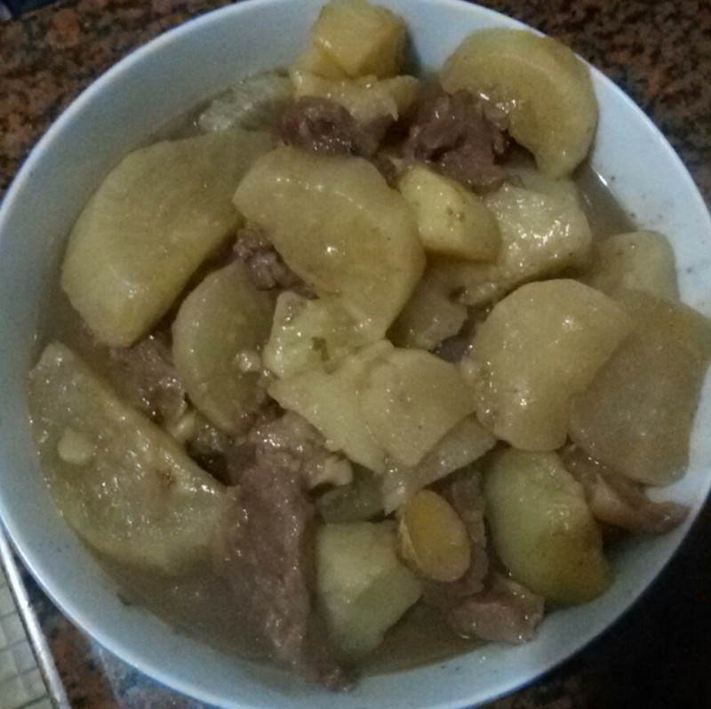 材料准备:牛腩500克左右,白萝卜300克,土豆两只(约300克),生姜三片、胡椒粉、五香粉、八角、山楂、陈皮各适量、 步骤: 1、 牛腩洗净,切块,备用; 2、 白萝卜、土豆分别洗净去皮,切块备用; 3、 山楂、陈皮、八角洗净,备用(山楂不但可以去肉的腥味,还可令牛腩更容易炖烂;陈皮不但可以去腥味,还可化痰祛湿呢); 4、 把上述所有材料全部放入锅后再加入五香粉和生姜,然后一次加足水开始炖,我们家用多功能电饭锅业炖这菜时选用的是“快煮”(每次快煮设定的时间一般是35分钟,我们一共按了三次快煮才把牛腩炖烂); 5、 牛腩炖烂以后即可换锅焖。也就是加入适量的酱油、蚝油、生粉、花生油、盐、胡椒粉和适量的水搅匀,然后放入铁锅内烧开,然后再把电饭锅里的牛腩土豆白萝卜都倒入锅内焖至汤汁差不多收干时即可关火装盘食用。