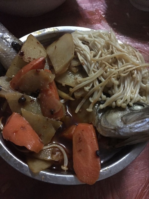 于是当天早上,我就买了三条鲈鱼,然后就把鲈鱼洗干净,点点的爸爸把这几条鲈鱼都腌了一下,这样烤出来的味道会很不错的,我准备了一些其他的素材,有土豆,胡萝卜,金针菇等等,在锅子里面焯一下油锅,放点老干妈以后,味道会很不错的。