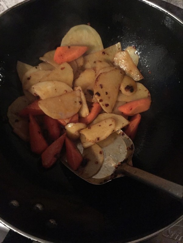 把蔬菜在油里煸一下,放入一勺老干妈炒一炒,然后起锅。