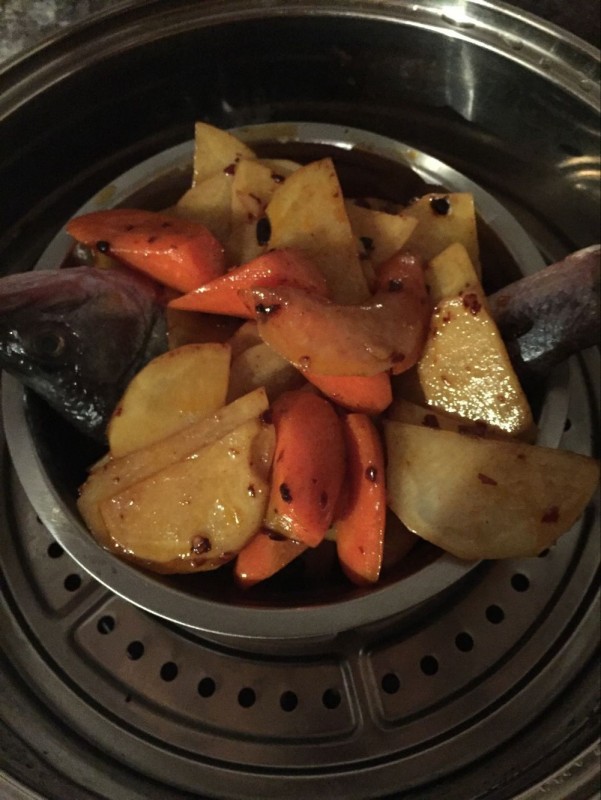 于是我们只能拿来蒸锅,已经腌好的鱼,把鱼放在锅上蒸十五分钟,然后把我们的蔬菜放进去再蒸了十分钟,就可以了,做起来也不复杂,就是注意火候,一开始大火蒸,后面水开了就用小火蒸了。