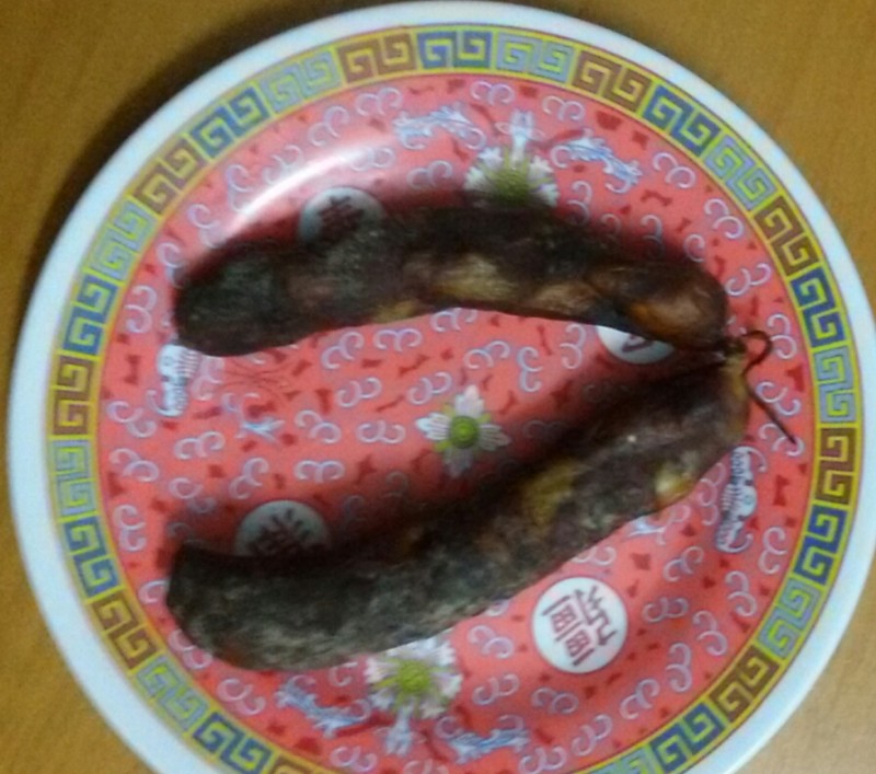 上两个星期天邻居送了两根腊肠给我,让我有点受宠若惊的感觉。因为我听邻居说,腊肠是她妈妈亲手用土猪灌的,可好吃了,而且里面并没有放辣椒。听她这样说,我就更加有点不好意思接受她的腊肠了,毕竟她大老远的从四川带回来的,可邻居把东西都-放下来后就走了,所以我也就接受了。 上个星期宝爸突然说要回家吃饭,因为我没有准备他的那一份菜,所以我就煮了这两根香肠。我本想像以前做腊肠那样清蒸来吃的,可后来想到邻居再三叮嘱我用清水煮煮,然后切开来吃最好吃了,然后我就照着做了。想不到刚煮好腊肠以后,小不点就嚷嚷着吃腊肠了,然后我就先切了两片来吃,一片给小家伙,一片给自己。我吃的那一片感觉特别美味,而且有浓郁的腊肉味,令人越吃越想吃。可小不点吃的那一片那竟然说是辣的,然后他就只吃了一口就吐出来了,剩下的那些就还给我了,然后我就纳闷:明明我刚才吃的那一小片一点都没有辣味,再说,这两片腊肠都是在同一根腊肠上切下来的,小不点吃的那一块怎么会是辣的呢?邻居明明有告诉我这腊肠是没有添加辣椒的啊。