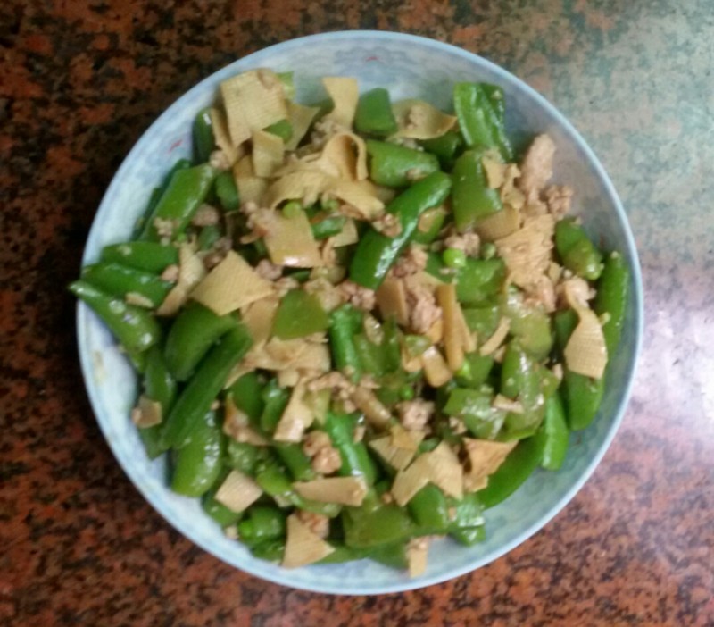 材料准备:荷兰豆(约400克)、豆皮半张(约一元钱)、瘦肉半斤、生姜 步骤: 1、荷兰豆去头尾,剥去丝,然后用淘米水或盐水浸泡二十分钟左右,然后再用清水洗净,捞出晾干备用; 2、豆皮洗净,切细,备用;生姜洗净,切成姜丝,备用; 3、瘦肉洗净,剁细(因为孩子不爱吃大块的肉肉,所以我只好把瘦肉都剁细,但也不用剁成肉末,这样他就喜欢吃了)备用; 4、锅洗净,然后加入适量的清水大火煮,水煮开以后就把荷兰豆全倒到开水里稍煮一小会儿,待其变成绿色后即可捞出沥干水,备用; 5、把锅内飞过荷兰豆的水全倒掉,然后洗干净,然后烧热锅,然后加入适量的花生油,然后加入生姜丝稍爆一下,接着再加入瘦肉末、豆皮稍炒一下,然后再加入荷兰豆一起翻炒,然后再加入生粉水(由酱油、蚝油、盐、生粉和水组成),待汤汁差不多收干时即可关火盛出食用。