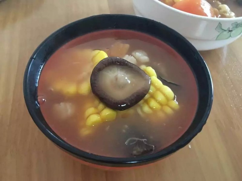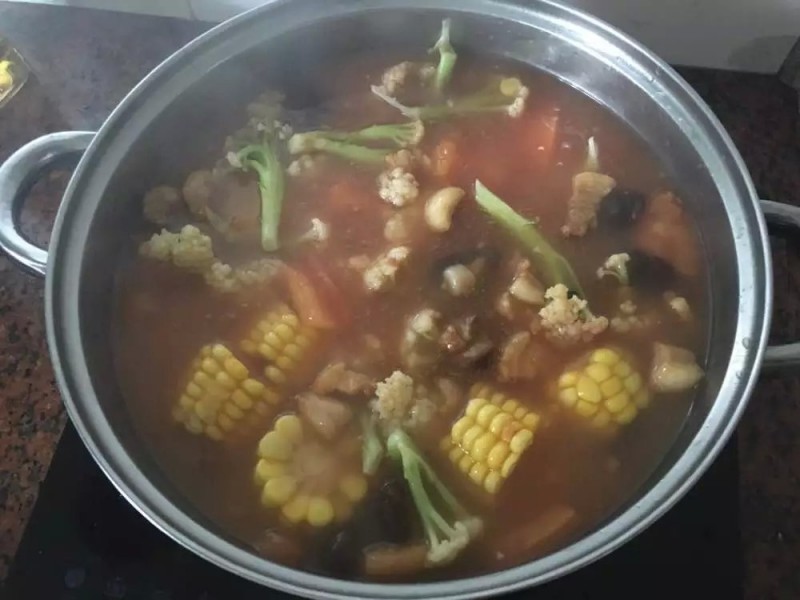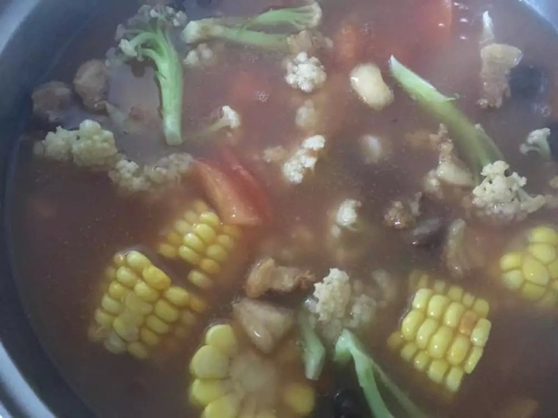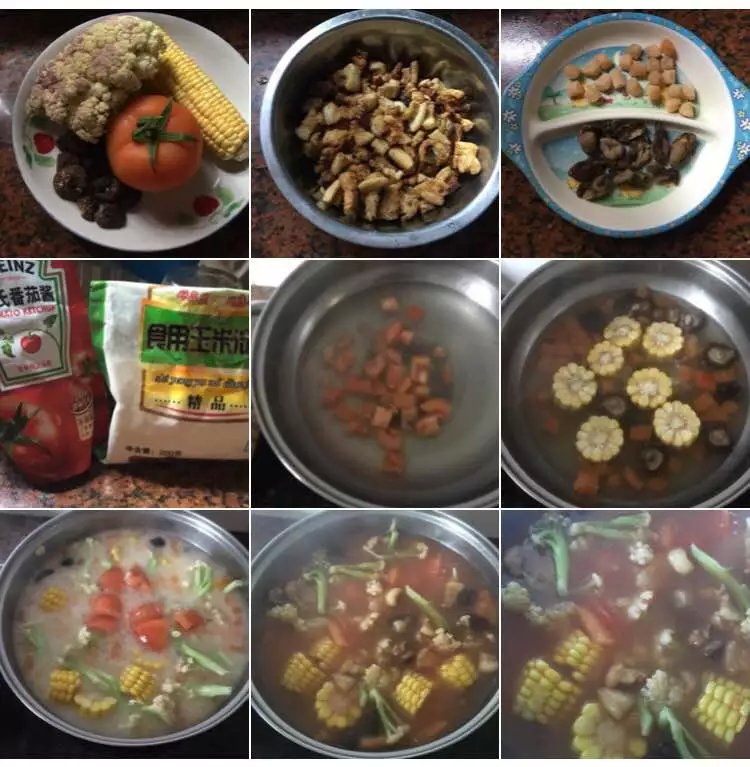 我们聚餐吃的“蔬菜羹”里面的主要材料是花椰菜、煎带鱼、炸醋肉等,家里没有这些现成材料,就按照自己的想法来操作,先把西红柿切丁下水煮开,再加入干贝、蚝干一起熬。干香菇泡发后与玉米也一起下锅煮,看起来像一锅大杂烩了,最后放的是西红柿和油梭子。煮开后,最后就是加点水与淀粉融化后沿着锅沿缓缓倒入,一边倒一边搅搅拌防止糊锅,等到水淀粉慢慢成芡状,再加些番茄酱,一点点盐就可以了,下一回试试用生粉做羹汤看看会不会好一些。