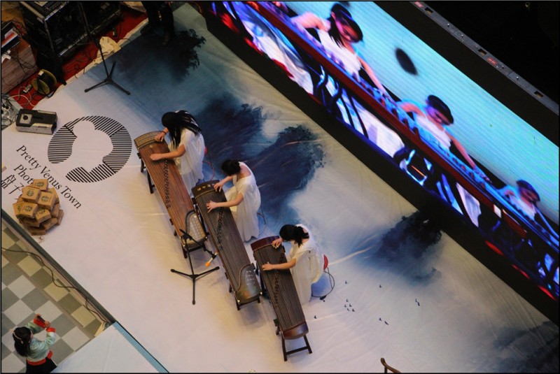继续逛商场的节奏,依然是妈妈的最爱,最起码在Aric的心里是这么认为的。很多次听到小家伙向爸爸吐槽女人逛商场的节奏跟不上,都会被爸爸善意的解释了。要想有个幸福的家庭,就要去原谅和理解女人心里的虚荣感,这是爸爸的心声。每每听到这话,我的眉心都在隐隐颤抖,不想承认有种无影脚想踢过去的冲动,只好选择自动屏蔽这不符合我好心情的话语。不过爸爸的改变确实很大,想当年这爷们可是特大男子主义的呢,而现在嘛,哼哼,还不是乖乖的被我压制住了嘛。 巧合遇到了商场三月旗袍魅力行的活动,是由盘子女人坊和中国魅力女性俱乐部合作的活动。我们当时在商场的四楼吃饭,吃过了饭就打算在商场里溜达溜达、逛一逛,就在中央的活动区看到了。话说从四楼往下看真真的是很不同的感觉啊,可能还无法身临其境,但是却看到了另类的美。老公兴趣不大,Aric倒是趴在玻璃的扶手前往下看,时不时发出惊叹声,说旗袍装很美,弹得古筝很好听云云。我纳闷的往下看,儿子的眼神真好,这么远,这么高也能观察的这么仔细?!