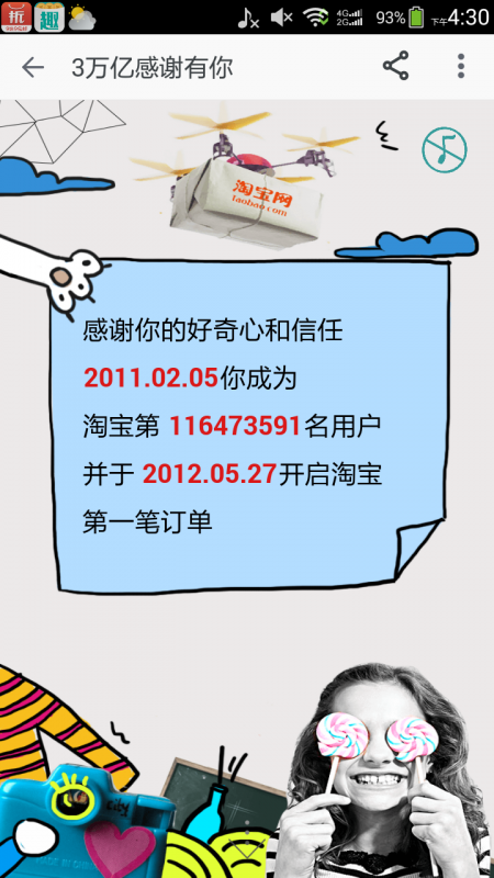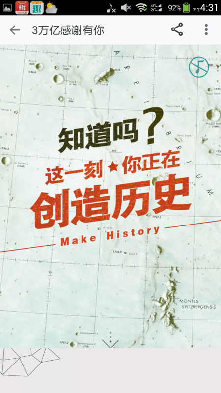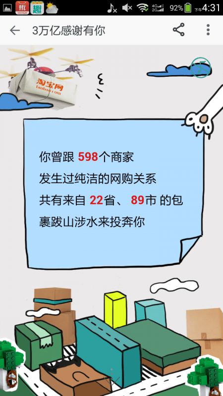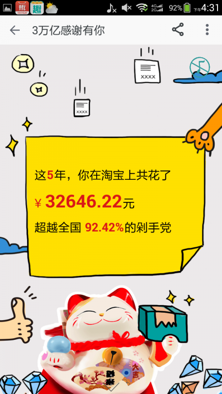 手机没电充电的,刚刚看下充满了,再加上我要上传照片,就打开了无线网,收到一条淘宝信息,本来以为又是推荐购买东西的,打开一看,显示的:知道吗?这一刻你正在创造历史。我很疑惑,就往下继续看,这原来创造的是花钱的历史啊,真是坑,说的是我在购物上面花了多少钱。