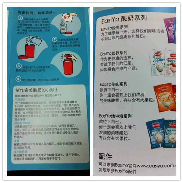 说明书一面是英文一面是中文,详细列出了easiyo产品的特点:新西兰制造,无人工香料,营养又美味,最重要的是可以全家一起做哦!