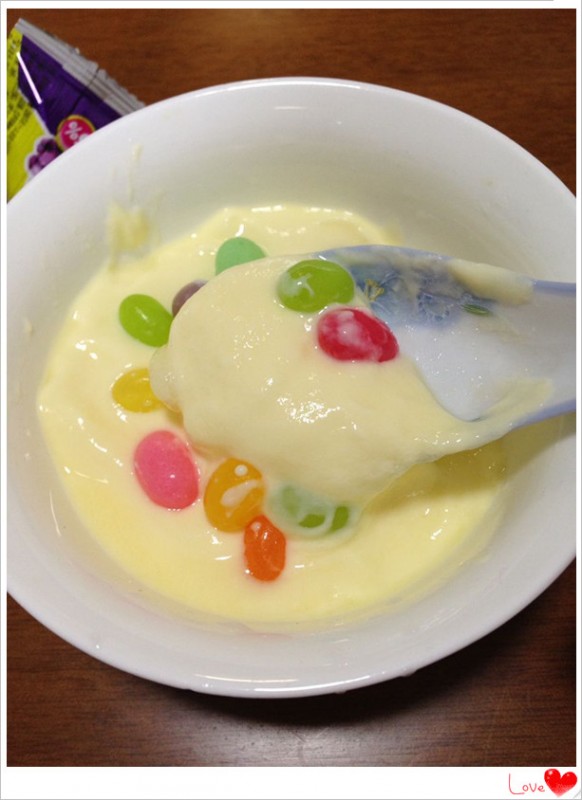 彩豆软糖+酸奶:过年买了很多糖果,一直没怎么吃,这回排上用场啦,软糖口感有点偏甜,裹了一层酸奶正好让浓甜味变淡成酸甜味,糖块也没那么粘牙了。