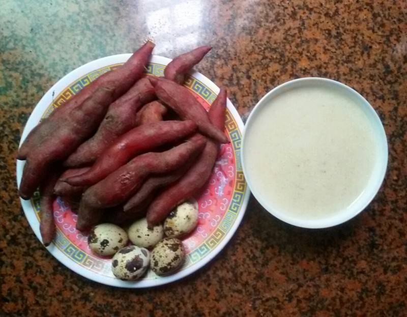 其实,做米糊时的时候加入瘦肉以后,我觉得米糊不但更营养,而且也更美味了,平时没用过肉来做米糊的朋友不妨尝试一下。由于乡下捎回来的那些红薯我们还没有吃完,加上小不点又特别喜欢吃红薯,所以我又用电饭锅煮了一碟番薯,看着冰箱里还有几只鹌鹑蛋,然后我就把它们和番薯一起都一锅煮了。 用红薯、鹌鹑蛋来配着花生绿豆燕麦瘦肉米糊喝,估计我们在外面也很难找到这样的营养早餐吧。