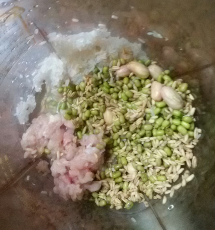 考虑到我们已经很久没吃绿豆了,所以我就琢磨着用绿豆来打米糊了。可单纯用绿豆来打米糊却不是我的风格,我一般都会配上其他的东西一起做米糊的,这样做出来的米糊不但美味,而且营养丰富呢。看到家里冰箱里还有花生、燕麦和少量的瘦肉,于是我就想把它们放在一起打成米糊了。 做花生绿豆燕麦瘦肉米糊的时候,大家一定要注意的一点就是绿豆的量不能放太多,否则就容易糊了,糊了的米糊不但不好吃,而且豆浆机会特别的难洗,所以大家一定要掌握好它们的分量。下面简单说一下花生绿豆燕麦瘦肉米糊的做法。