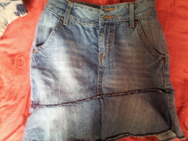 她妈妈不好意思,认为穿过的给别人算什么事,她自己认为这不算事,我也没觉得有什么不妥,不知不觉中我们都认识13年了,时间过的真快啊。生完宝宝变胖是硬伤啊,我自己也扔了不少衣服,都穿不了了,唉。这次好友带了5条牛仔裤来,两条长裤,两条夏天穿的短裤,还有一条夏天穿的牛仔裙子。 牛仔裙子,嘿嘿,这个真是不好意思啊,我能说我是女汉子吗?虽然现在偶尔也会穿裙子,嘿嘿,不过这种形式的裙子貌似真的没有穿过,看着像是鱼尾裙,这是让我一秒钟变淑女的意思嘛。看着还挺喜欢的,无论是女汉子还是淑女应该都是比较喜欢这种款式的。