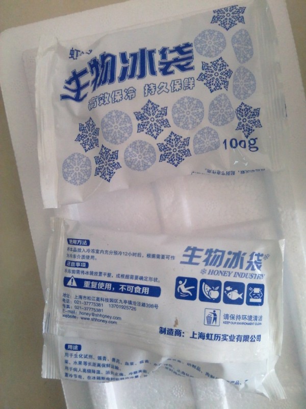 发的EMS,本来我一直觉得邮政是很慢的,却没想到一天的时间就到了,下午四点多卖家发货的,第二天上午10点左右就接到了快递员的电话,这太让我意外了。收到后,打开一看,冰袋还没有化掉,我赶紧大概的看了下生产日期和包装,就把这放进冰箱里了。生产日期都是非常的新鲜,都是最近的。