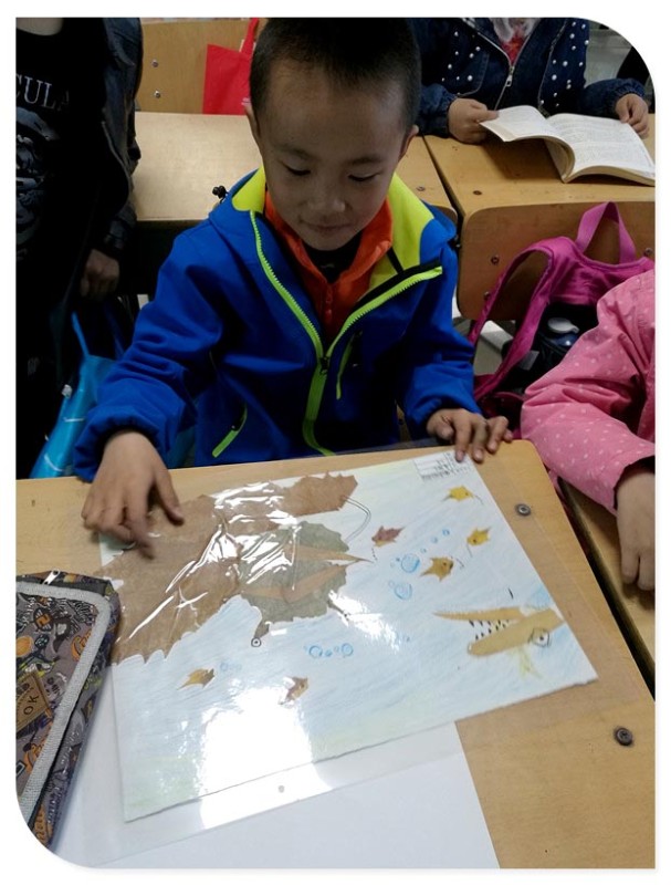 上周末小家伙有美术课,虽然是春天里的时光,但是有风儿吹起来却也是让人感觉冷飕飕的,此时的天气也是孩子的脸说变就变阴晴不定的,倒是小家伙们完全不受天气的影响,依旧的跑跑跳跳,开心连连的。小家伙来上课的时候教室里的学生还没有全部到齐呢,美术老师正在忙着将以前举办的“寻找秋天美”的树叶贴画返还给孩子们,小家伙当时也参加了,还记得作品的名称是“大嘴巴青蛙”,活动展览的时候,孩子们的树叶画都被工作人员进行塑封了,如此以来倒是可以长时间保留了。这个活动的树叶贴画展览也是持续了好长一段时间的,自己当时还把比较好的树叶贴画作品拍照了呢,留着备用,小家伙上小学做个贴画啥的就不愁没有素材可用了。小家伙拿到了自己的贴画还看的很认真的,以后孩子的作品来塑封保存这个方法值得借鉴。