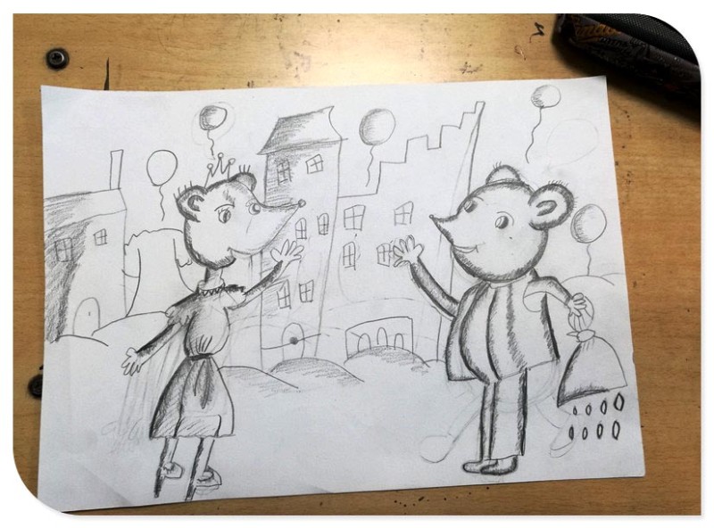 看看宝贝画的两只老鼠的画面吧。两只老鼠从形态上来看好像是一只是老鼠小姐,另外一只则是老鼠先生。老鼠小姐还穿着高跟鞋呢,只是小家伙给老鼠搭配的高跟鞋的跟着实的很高啊,另外老鼠小姐上面还带了王冠呢,这是一幅有故事的画面,一只老鼠公主遇上了老鼠王子,剩下的就凭自己展开想象吧。小家伙在两只老鼠线条的处理上还是有重点的,形象的阴暗面也比较的明确。这幅画面的背景小家伙是画的城堡感觉的,只是这些建筑的阴暗面展现的不是很好。空中还漂浮着很多气球呢,一个喜庆的场面,一对幸福的老鼠。
