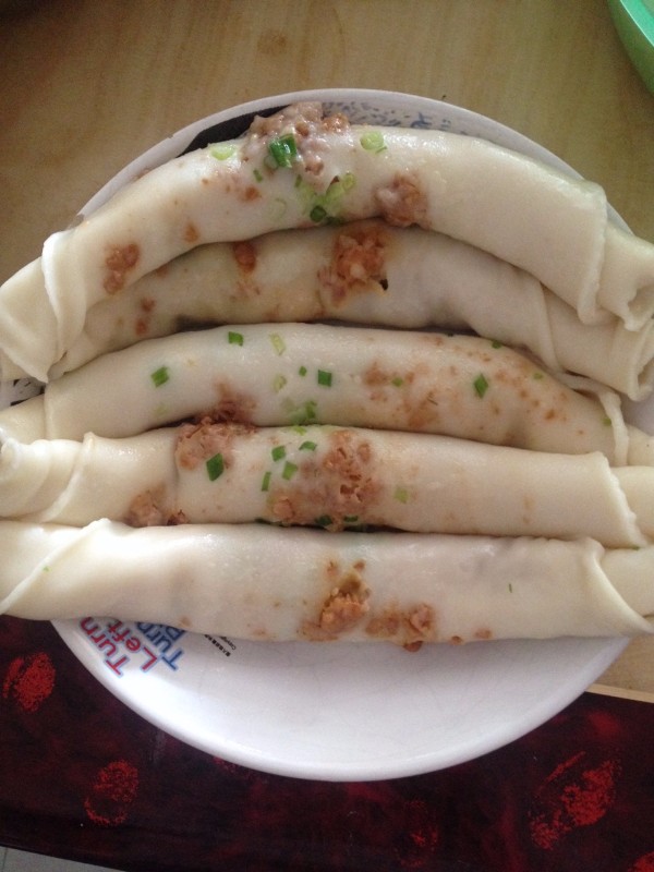 一般开盖后你会看到卷筒粉会嘭起来,这就说明蒸熟了。这时你可以拿双筷子搁在托盘下把托盘拿出来晾凉,然后放另外一个托盘上锅蒸。晾凉后的卷筒粉是这样的