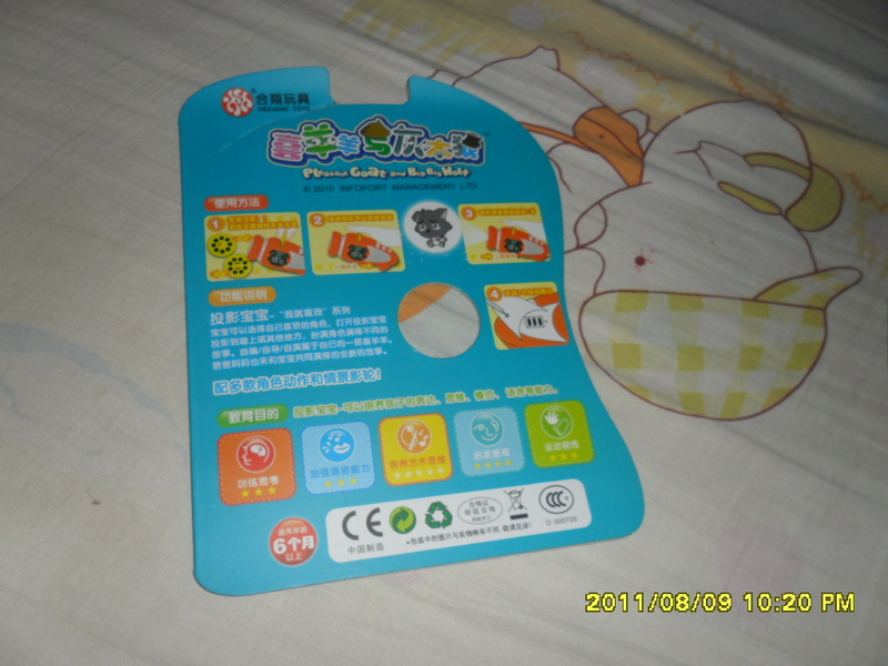 记得好象是看到越越妈晒这个礼品,说感觉这个礼品还不错,宝宝也喜欢。我想我家宝宝跟她家差不多大,我家宝宝也一定会喜欢,于是就兑换了这个“喜羊羊与灰太狼投影宝宝投影乐”。说起兑换这个礼物还有一点小插曲,当时我是七月十五号兑换的,以为就积分兑换就行了,却把运费忘记了,还好站内管理员提醒,不然就要在那里怎么等也等不来了。七月十九号我们去旅行,七月二十三日回来,第二天我就去学校看礼品来了没有,这次有点失望。第二次去看礼品来了没有是八月四日,刚好那天我值班。一到学校我就问他有没有我的包裹。他想了一下说没有,我想不可能,那么多天了,后来又问他一次,他才进去找了找,果然是已经到了。