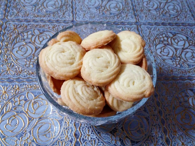 前几天就把这些简单入门的菜单找好,材料也都购买准备在家里,计划着一天做一样,每天都能尝新,为自己无聊的孕期增添些乐趣,最大收益的当然还是儿子,每天放学不用在外面买垃圾食品当点心了,回家一进门就能闻到美食的香气。可惜下午给他做的薯条失败,准备晚上做个曲奇饼干弥补一下。仔细对照食谱,按食谱的量分配好,只许成功,不许失败。 准备材料: 黄油100克,面粉110克,白糖40克,鸡蛋一个,盐1克。 步骤: 1.将黄油室温化软,加白糖,用打蛋器打发,我没有电动打蛋器,手动打得手发酸。打到黄油顺滑,糖融化。 2.鸡蛋打成蛋液,分两次加入,跟黄油一起打发均匀,使黄油变白,蓬松。 3.面粉过筛加入,跟黄油搅拌均匀,加盐,再搅拌均匀。 准备就绪,把材料装进裱花袋。烤盘铺上锡纸,往锡纸上转小圈挤花型,相邻之间要留空隙。烤箱预热180度,放入烤盘,烤18分钟左右,出炉。 做出来的曲奇饼干松脆可口,奶香味浓郁,一点都不比外面卖的差。就是卖相差了点,花型不饱满。以后再也不去买零食了,自己做,丰衣足食啊。。。