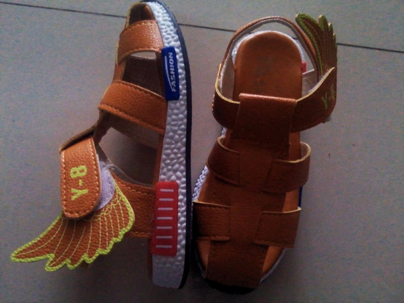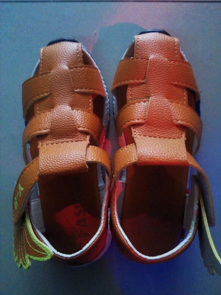 拆开包装,儿子拿出鞋子,看到有一对小翅膀,好兴奋,立即表示要穿,我一看这鞋肯定大了,可是孩子却是不管的,穿上后,问我:“妈妈,我怎么还飞不起来啊?”这小子,真是让人不知道说什么好,看到鞋子上有翅膀就认为穿上可以飞,我的宝贝啊,怎么能这么可爱呢! 儿子的脚长他不给我量,我就大概的用手量了下,然后就上网买了,当时没想起来应该量下孩子的运动鞋的鞋垫的,就直接购买了,想着离夏天还有一段时间,还稍微拍的大一点的,这下到好,儿子穿起来居然大好多,我就拿过皮尺量了凉鞋的内长,这卖家给的尺码根本就不准确啊,居然比标的还大以厘米,怪不得收到的鞋大好多,只能留着明年再穿了。