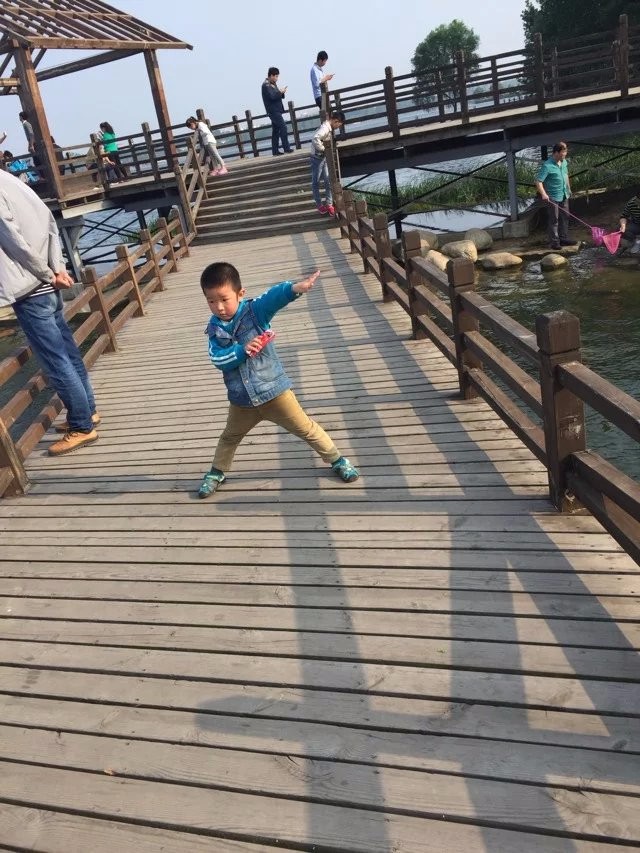 ![]() 宝爸应小家伙的要求,带上了小足球,陪小家伙一起玩。这小家伙可真的是精力旺盛,怎么跑怎么玩都不知道累的感觉。在爸爸给他示范了一个把球飞起来的动作后,小家伙仰慕极了,也一心追求达到那样的效果,但是总是不遂心意,小家伙又是气恼又是不甘的,自己在那儿练开了。还把球踢进一个小坑当作射门成功,自己玩得不亦乐乎的。时不时地还要我和宝爸陪练。 ![]() ![]() 玩出汗了过来擦擦汗喝点东西就又继续了,让他休息会儿都不肯。玩了阵足球,小家伙又开始玩起了他最爱的泡泡,追着泡泡到处跑,一个人玩得开心极了! ![]() ![]() 看着时间不早了,我提议往下面走,去沿河转转。小家伙一听马上一溜烟地先跑下去了。一到河沿,感觉温度都降了几度呢,一阵阵风吹得真是冷啊!还好拿着小马甲,赶紧给小家伙穿上。划船的人还真不少呢,河岸边上也到处是游玩和钓鱼的人们。 小家伙开心地跑着,一跑到木桥上就大喊上了海盗船了,他是海盗船长。我说那海盗船长快摆个pose让我给你拍照吧!小家伙双手各拿着一个奥特曼玩具,摆出手握方向盘的架势,嘴里还喊着:“海盗船要开动了,我是海盗船长!”哈哈,认真可爱的样子还真是搞笑呢。 ![]() ![]() ![]() ![]() 在木桥上漫步,看着碧蓝的河水,迎着阵阵春风,那种清新惬意的感觉真是美极了!真想永远停留在这一刻! ![]()