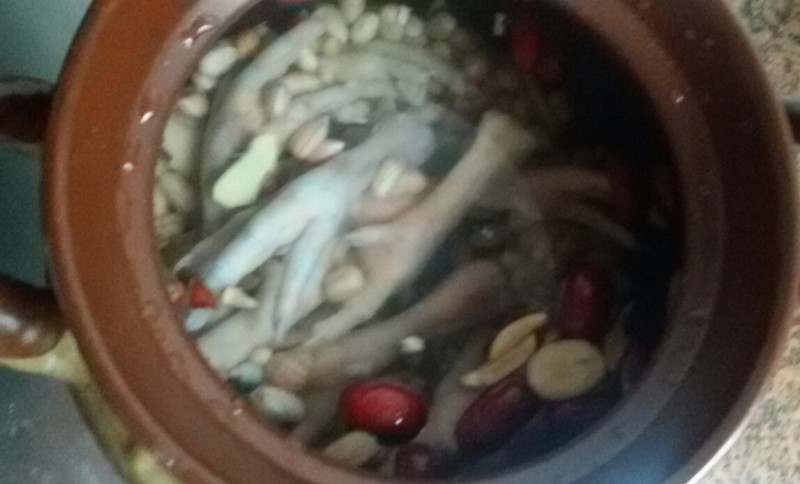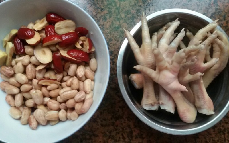 材料准备: 新鲜鸡脚约500克、黄豆30克、花生50克、红枣6枚、生姜一块 步骤: 1、 黄豆、花生洗净,提前浸泡一个小时左右(若忘记浸泡或没时间浸泡,也可用热水泡十来二十分钟),备用; 2、 红枣洗净,去核,切片,备用;生姜洗净,切成三片,备用; 3、 鸡脚洗净,然后放入烧开的水中飞一下水,然后捞出备用; 4、 砂锅洗净,然后把生姜片、红枣片、黄豆、花生和鸡脚一同放入锅内,一次加足清水,盖上锅盖大火煲,水煮开后改小火继续煲一个半小时即可关火; 5、 调入食盐即可饮用。