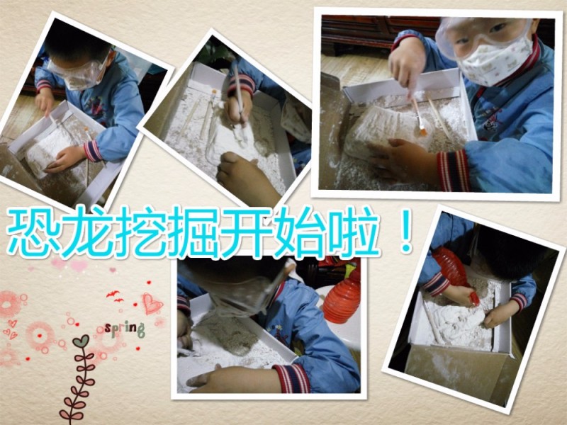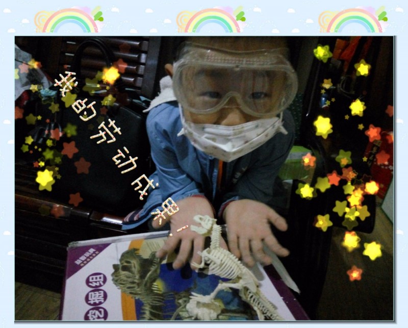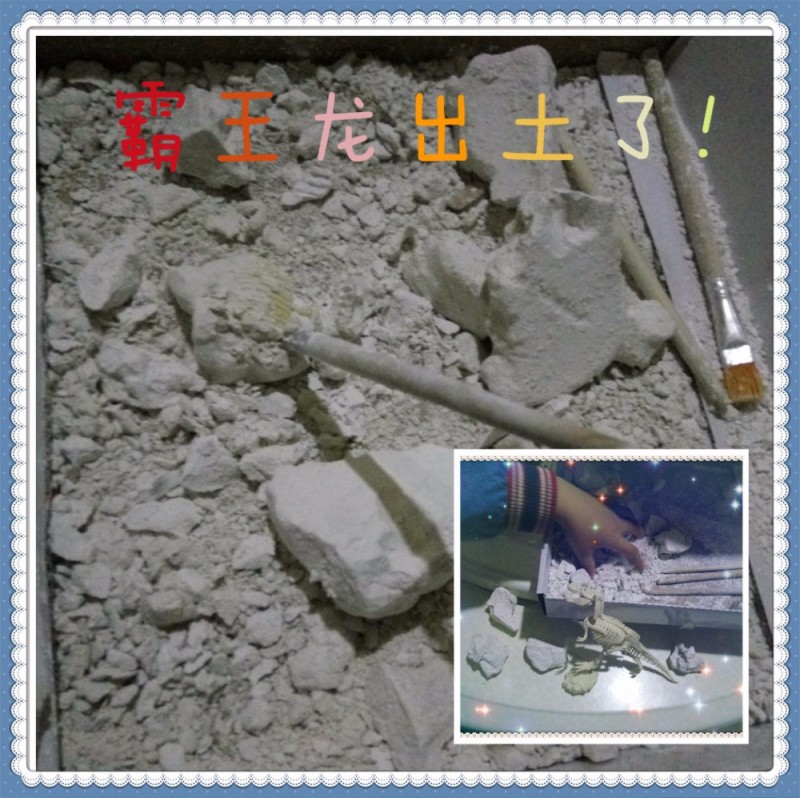 ![]() 上午9点还有培训班,就先放下了手中的挖掘工作。11点回家继续挖,到了吃午饭的时间还没有挖掘完工,我们没管孩子,先吃饭,吃完饭,发现孩子挖的有些累了。手上、头上、脸上都是白灰粉,也算是加了一会儿班,孩子说:“妈妈,我肚子饿的咕咕地叫,你能当我的助手吗?我要去吃饭了!”,我说没问题,帮着挖了两下。下午进行挖掘工作,孩子要找喷花的小喷壶。原来他发现了,喷点水石膏粉更容易挖而且灰也不太大了。下午越挖越顺手,花了不少的功夫,终于把大恐龙骨骼化石全部挖出来了。 ![]() 在挖掘恐龙化石的过程中,是充满了快乐、艰辛、惊险、成就感!也培养了孩子动手能力,让孩子在玩中体会到了遇到困难动脑想办法总会解决的快乐! 这是一只霸王龙化石骨架,孩子在挖掘中不仅了解了恐龙知识,也对考古、科普有了一定的感观认识。最后孩子还说:“妈妈那些土,我还要留着,说不定里面还有小化石呢!” 本作品未经作者许可不得转载,转载请征求作者意见。擅自转载使用,将保留追究其法律责任的权利! |