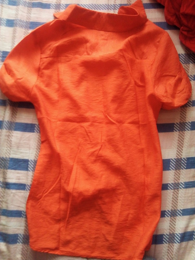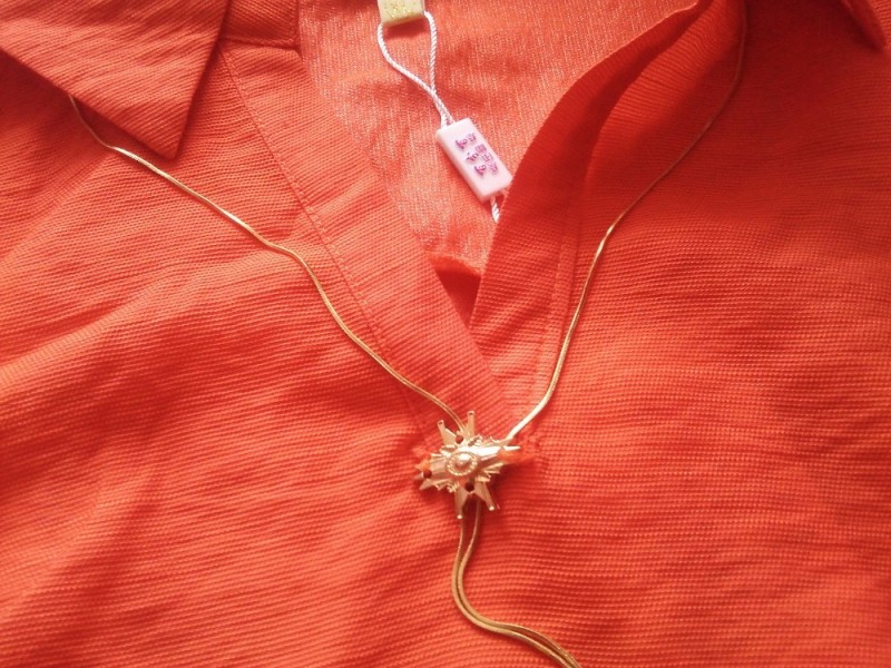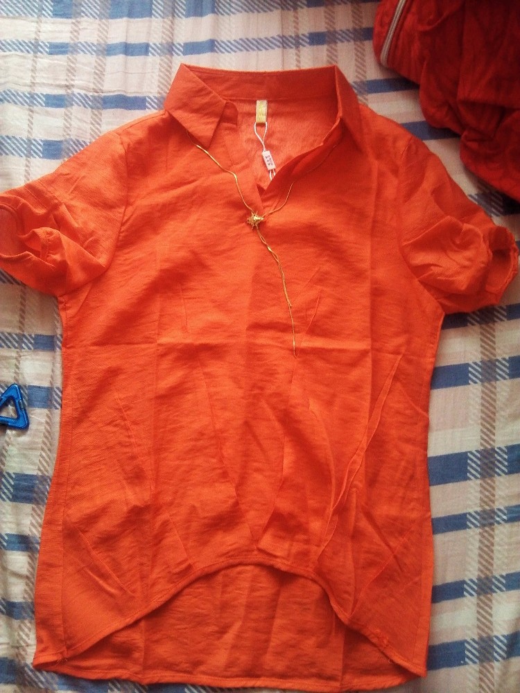 看旁边同款的还有橘红色的,就试穿了下,自我感觉良好,悲催啊,现在都是穿L码的啊,而这件衣服是XL的,讨厌的肉肉,喜欢就自然打算买下来啦。儿子那是一个劲的催促我离开啊,就才买一件,想再看看其他的,可惜没有我中意的了,就只买了一件。确认我买之后,卖家把短袖给拿过去了,我以为她是准备打包的,没想到却坐在了凳子上,去拿东西,我才知道这短袖还有条链子,黄色的,喜欢,一配上衣链子感觉又是不一样的。