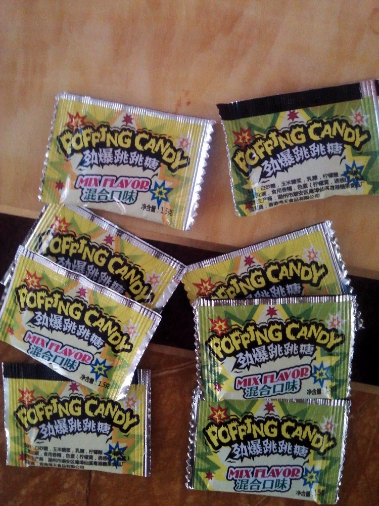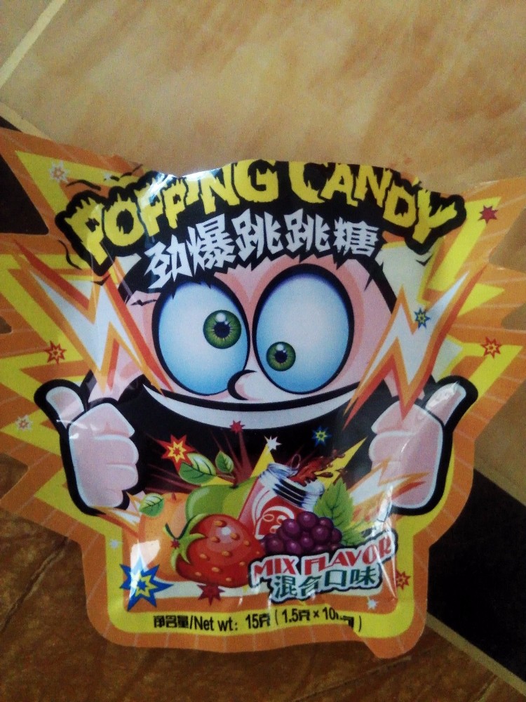 儿子这么大都没有吃过跳跳糖,这次看到就买个吃吃吧,包装色彩很鲜艳,颜色也多,付账后我看了下是2.9元,我们小时候貌似只有1毛钱吧,记不清了,反正挺便宜的,嘿嘿。。。这袋只有15克,10小袋,也就是说一袋只有1.5克,好少啊。现在买东西总是喜欢和我们小时候比,然后就觉得还是我们小时候东西好,哈哈。