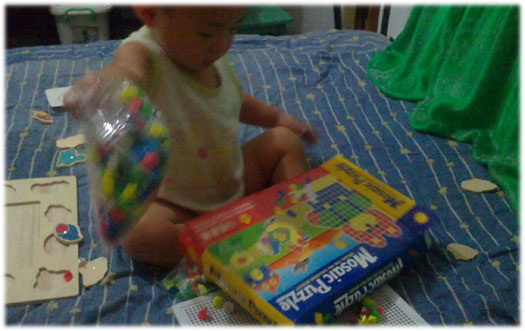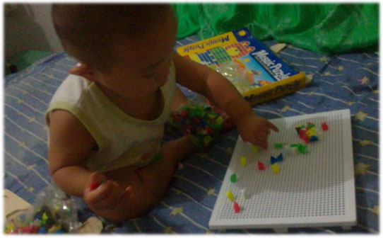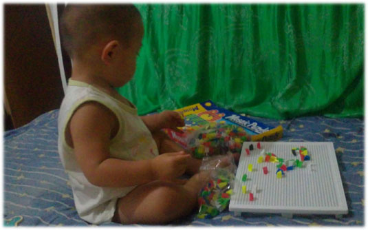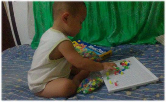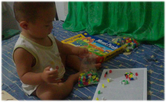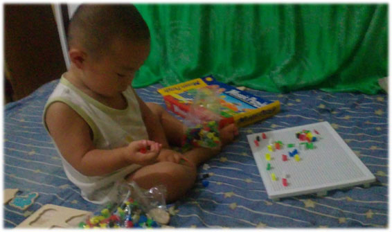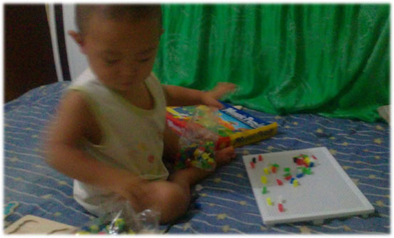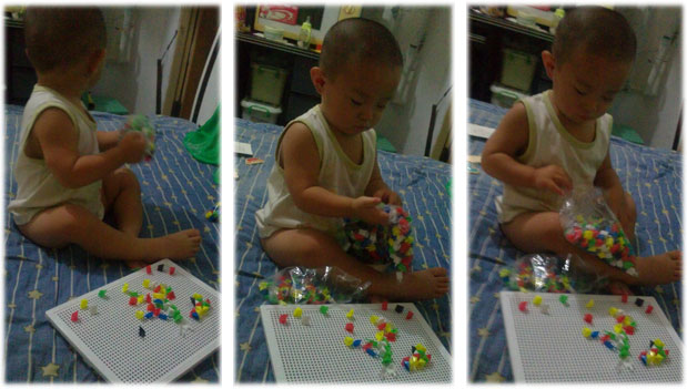 唉,孩子就是孩子,审美观不用特意培养,随随便便来点小想法,就比大人有创意的多!看着他认真的码着彩钉积木,我不再给他添乱,拿起手机咔咔拍了几张,想不到这么无聊的玩具,他也能如此认真的玩上一会儿~~可人的忍耐总是有限的,大概还不到十分钟吧,他就开始有些不耐烦了,呵呵,正常,换作是我,连五分钟都玩不了!
