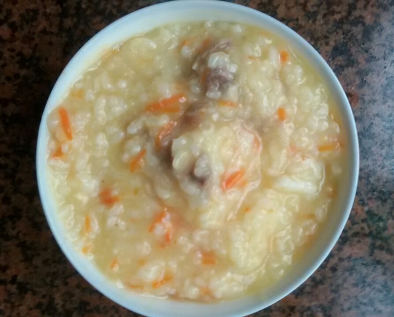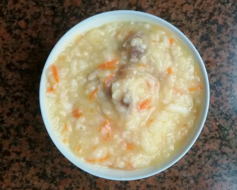 步骤: 1、 铁棍山药洗净,削去皮,然后用刀把山药都拍碎(这样不但利于吸收,也特别适合孩子吃,而且也会令粥变得有粘性,看起来更有食欲),备用; 2、 生姜洗净,陈皮洗净,备用; 3、 胡萝卜洗净,削去皮,然后用擦丝器擦成胡萝卜丝(因为小不点平时不喜欢吃胡萝卜,所以我只能把它们都擦成胡萝卜丝了,这样小家伙就会不嫌弃它们了),备用; 4、 排骨洗净,斩块,备用;大米洗净,备用; 5、 砂锅洗净,然后把大米、生姜片、陈皮、排骨一同放入锅内,一次性加足水大火煮开; 6、 大火煮开后再加入山药泥和胡萝卜丝,然后加入一小勺花生油(既可提香,亦可防止米粥溢出) 煮开,然后改小火继续煮至粥熟; 7、 粥熟后调入适量的蚝油、食盐和花生油,然后关米晾凉盛出食用。