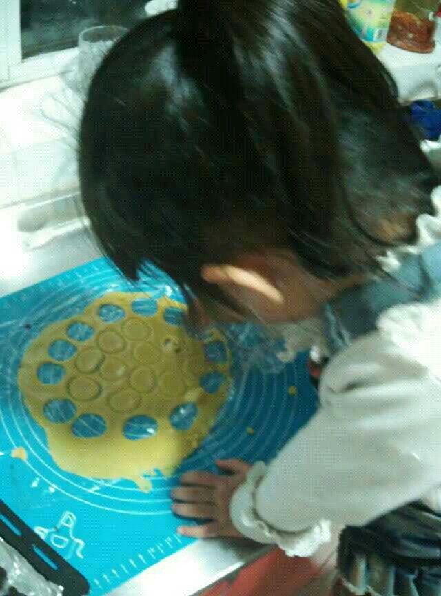 写完作业吃了饭,我们在厨房做饼干,她一边干活一边跟我说,让我赶紧把她做饼干的照片拍下来传给她同学。我本来想象征性的给她拍两张,结果我那破手机不知道什么原因,拍出来的画面整个都是虚的,怎么调整也不管用。这下省事了,可以不用拍了。